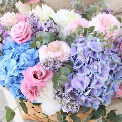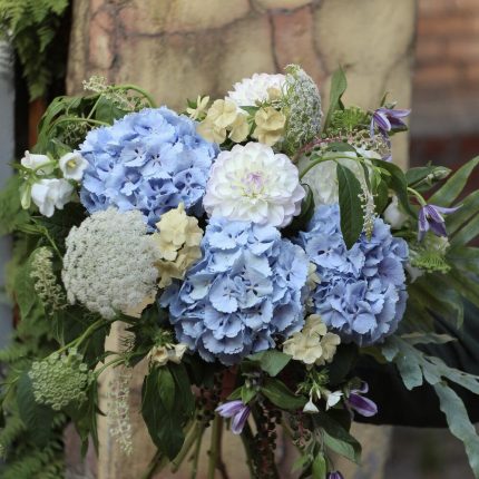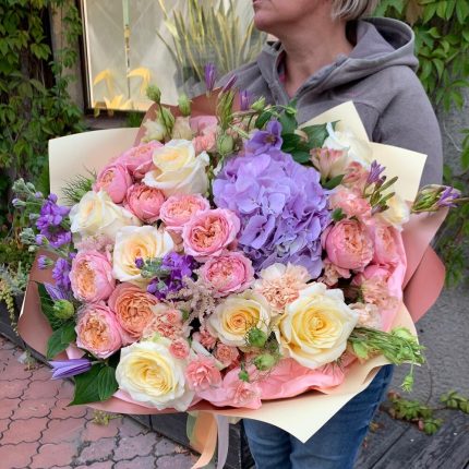 Авторский букет с розами Мента, пионовидными кустовыми розами, маттиолой и эустомой
