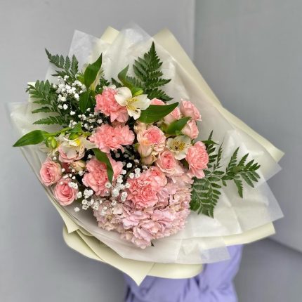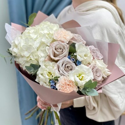Авторский букет из голубой Гортензии, пионовидных Роз и Хризантемы Момоко