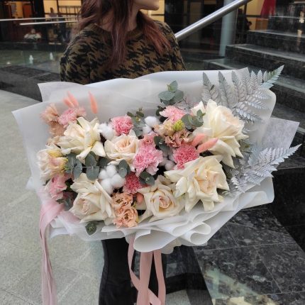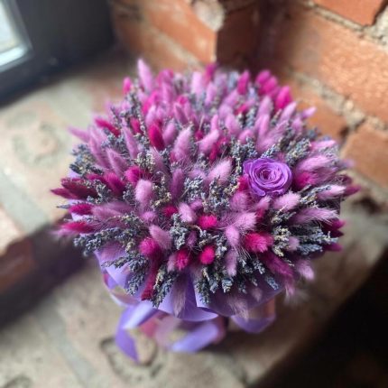 Букет из сухоцветов – лагуруса, лаванды и стабилизированной розы в шляпной коробке “Лиловые сны”