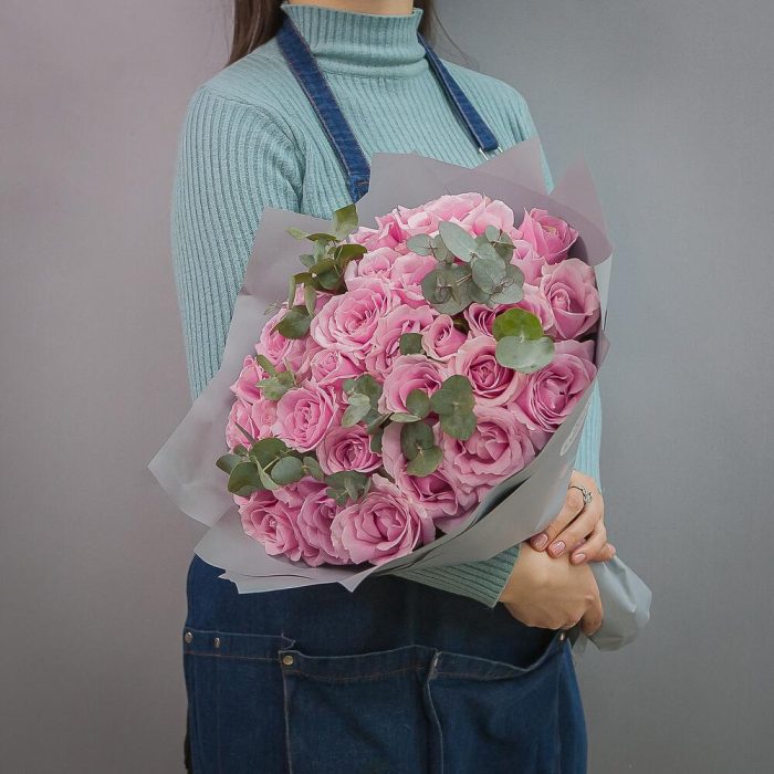Эвкалипт – 1 шт.розы – 35 шт.дизайнерская упаковка и атласная лента – 1 шт.