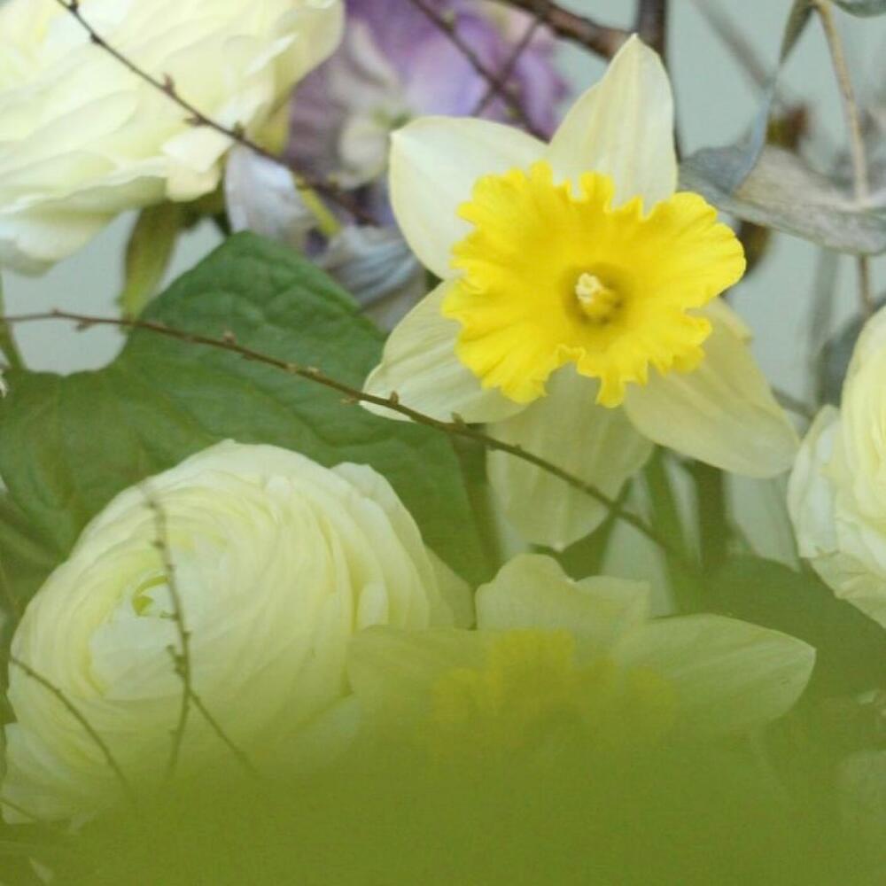 Ранункулюс – 3 шт.Нарцисс – 2 шт.лук полевой – 1 шт.Клематис – 1 шт.Маттиола – 1 шт.Овес – 5 шт.Ветка – 3 шт.Эвкалипт – 4 шт.Лента – 1 шт.