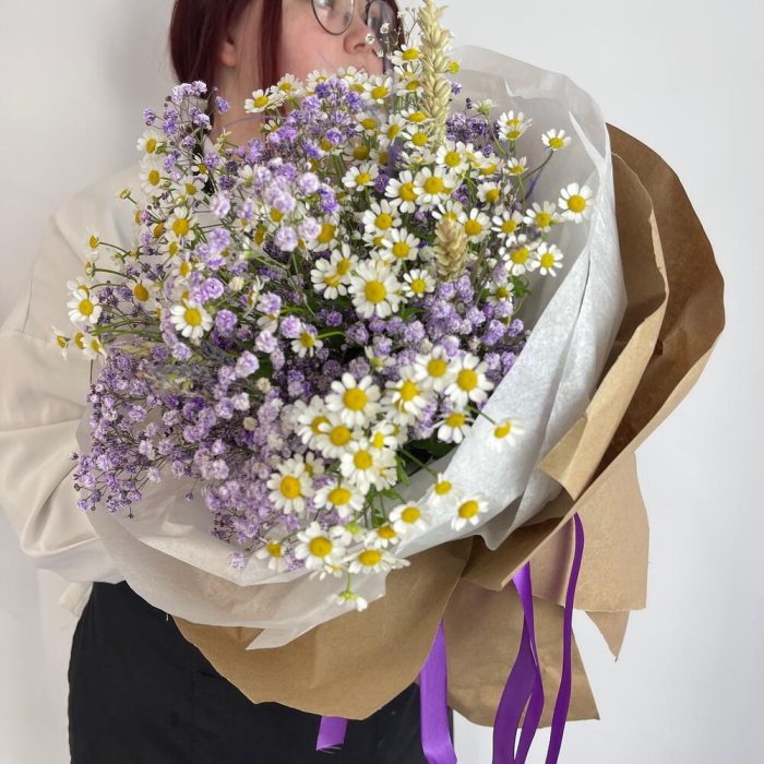 Букет из ромашек и гипсофила в крафт