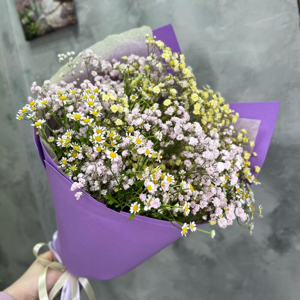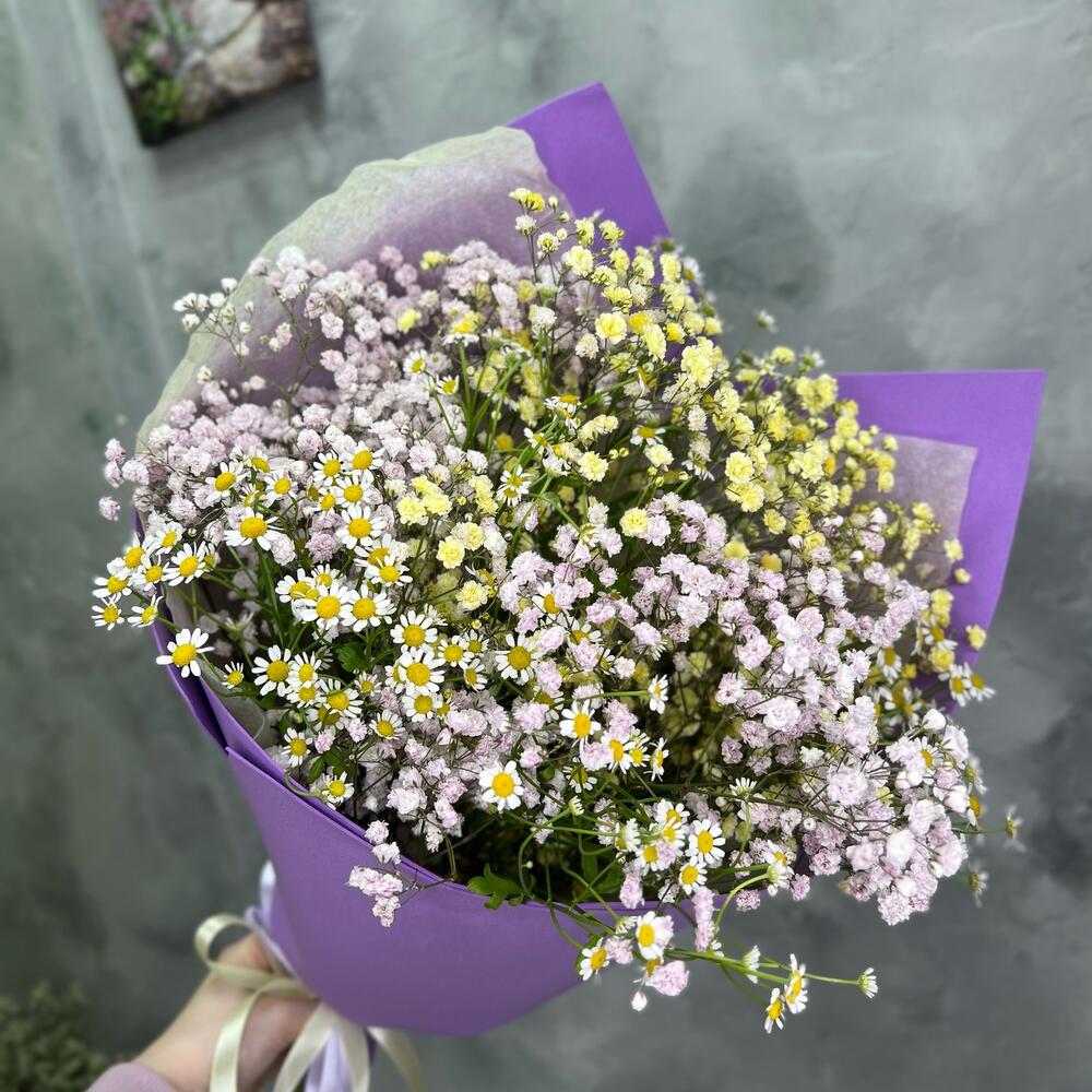Лента атласная – 1 шт.Матрикария – 4 шт.Упаковка дизайнерская – 2 шт.гипсофила радужная – 3 шт.