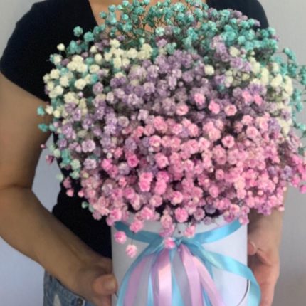 Лента атласная – 2 шт.Коробка шляпная – 1 шт.Оазис флористический – 1 шт.гипсофила радужная – 4 шт.