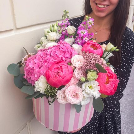 Пион – 19 шт.Эвкалипт – 5 шт.Гипсофила – 2 шт.Фисташка – 3 шт.Лента атласная – 1 шт.
