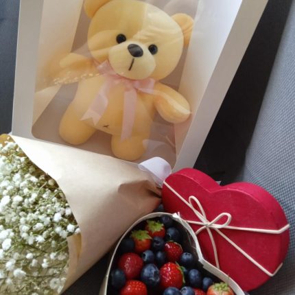 Гипсофила – 3 шт.Клубника – 250 гр.Лента – 1 шт.Голубика – 100 гр.Крафт упаковка – 1 шт.Пакет подарочный – 1 шт.Мишка плюшевый – 1 шт.коробка сердце маленькая – 1 шт.
