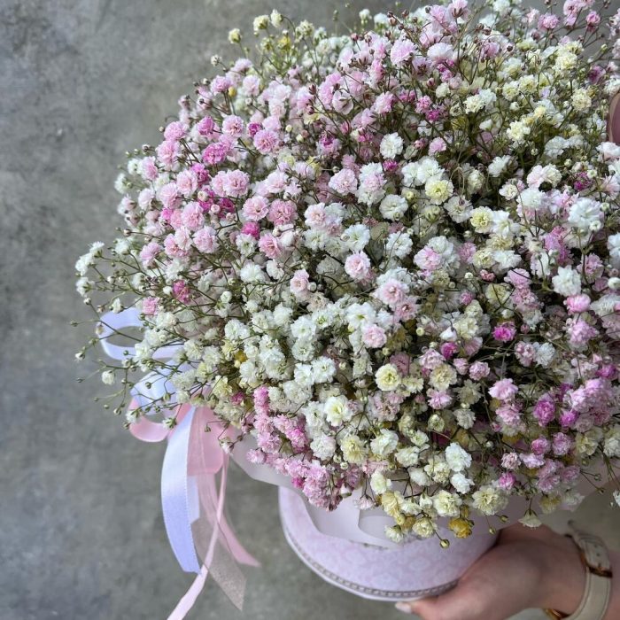 “Сиреневый туман” – композиция из гипсофилы в шляпной коробке