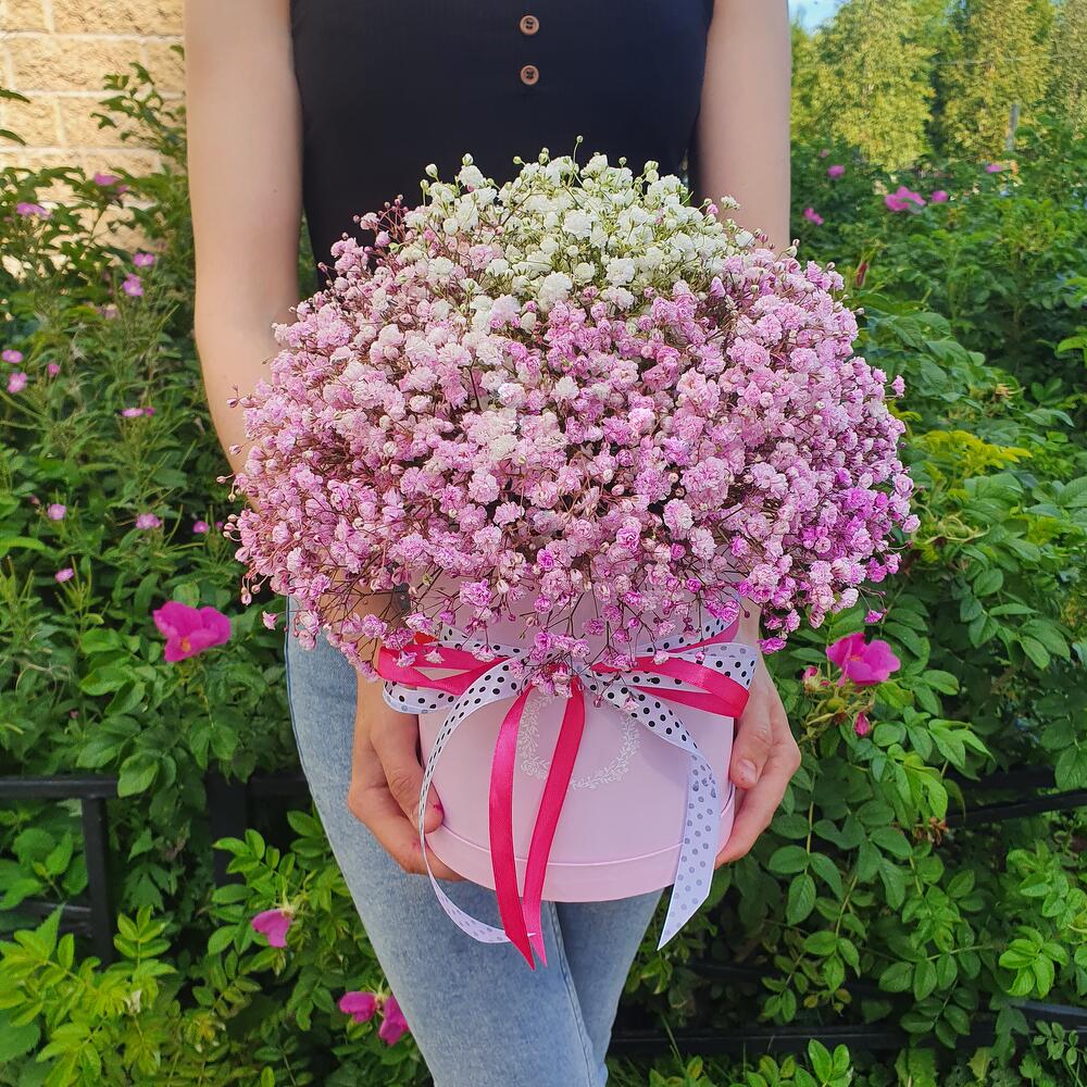 “Сиреневый туман” – композиция из гипсофилы в шляпной коробке