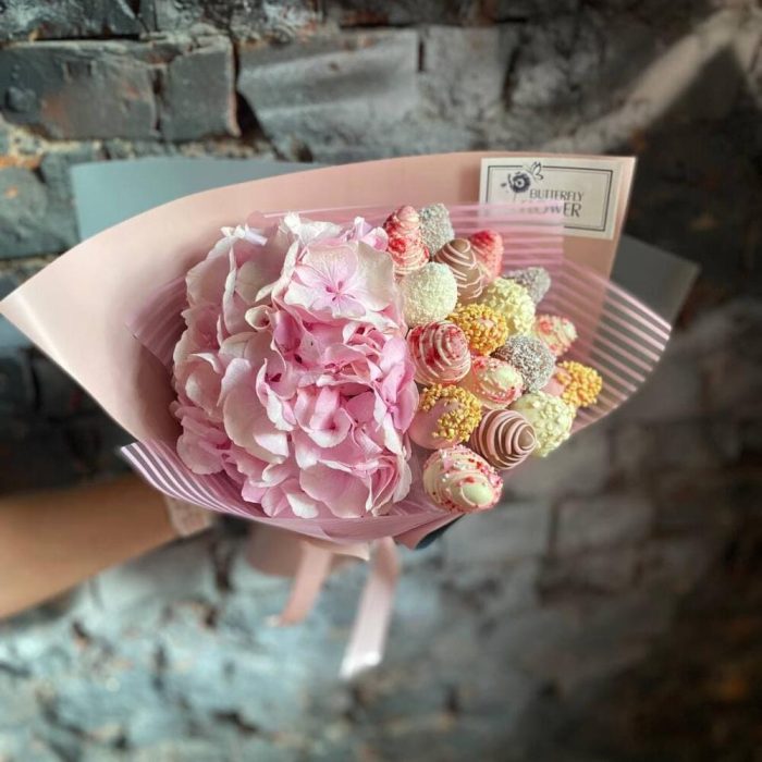 Букет из клубники в шоколаде и гортензии “Клубничные бабочки”