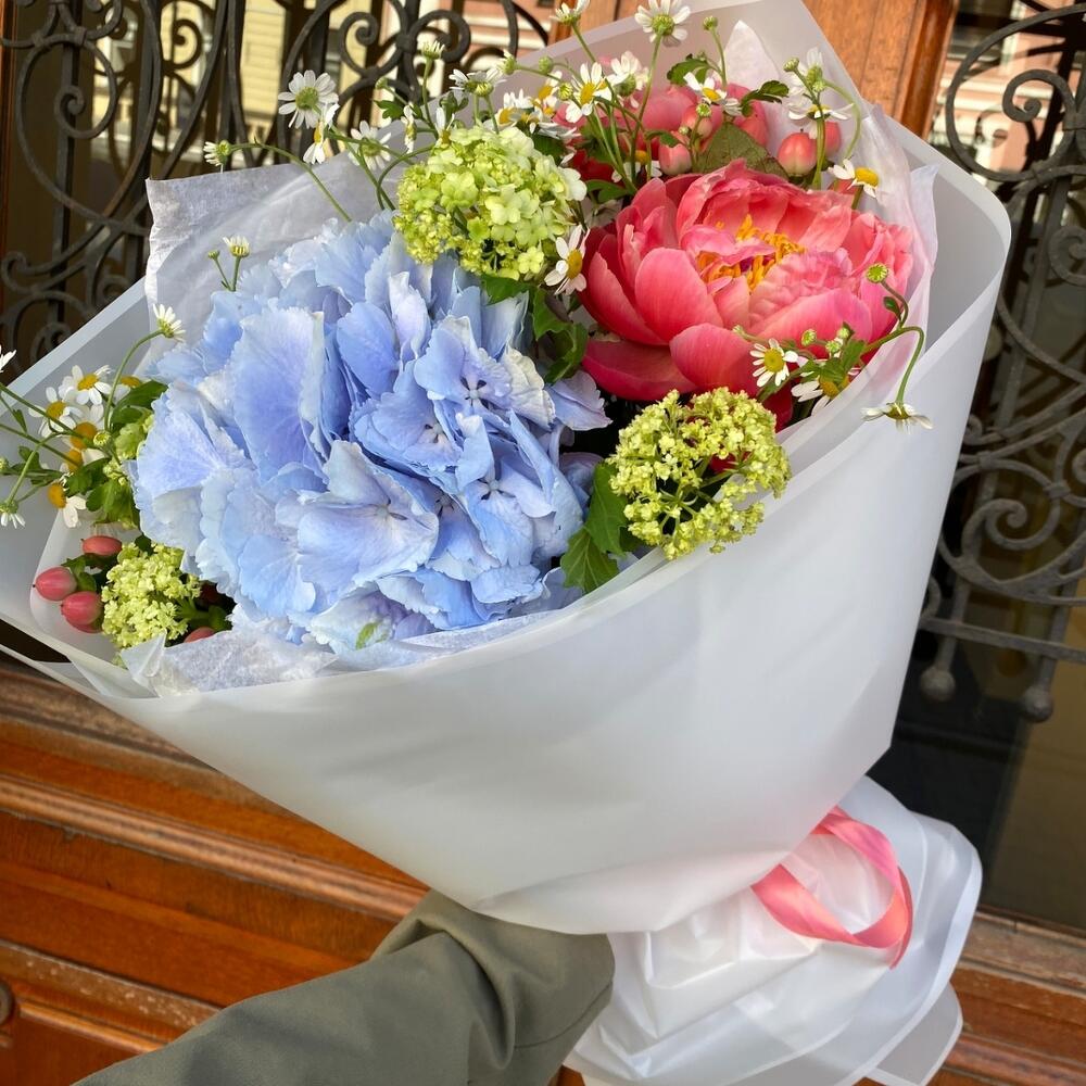 Яркий, сочный летний букет, созданный из невероятных пионов гортензии, вибурнума, ягодок и ваксфлауэра!Такой букет точно понравится яркой и энергичной получательнице, и будет долго радовать её.К букету прилагается открытка с вашими пожеланиями, инструкцию по уходу за цветами и приятный комплимент от нашего магазина – шоколадка.Мы также будем рады отправить вместе с букетом конфеты, шоколад ручной работы или б/а вино по вашим пожеланиям, просто напишите нам в личные сообщения. Заказывая наш букет, Вы всегда получите исключительный сервис и заботу о клиенте