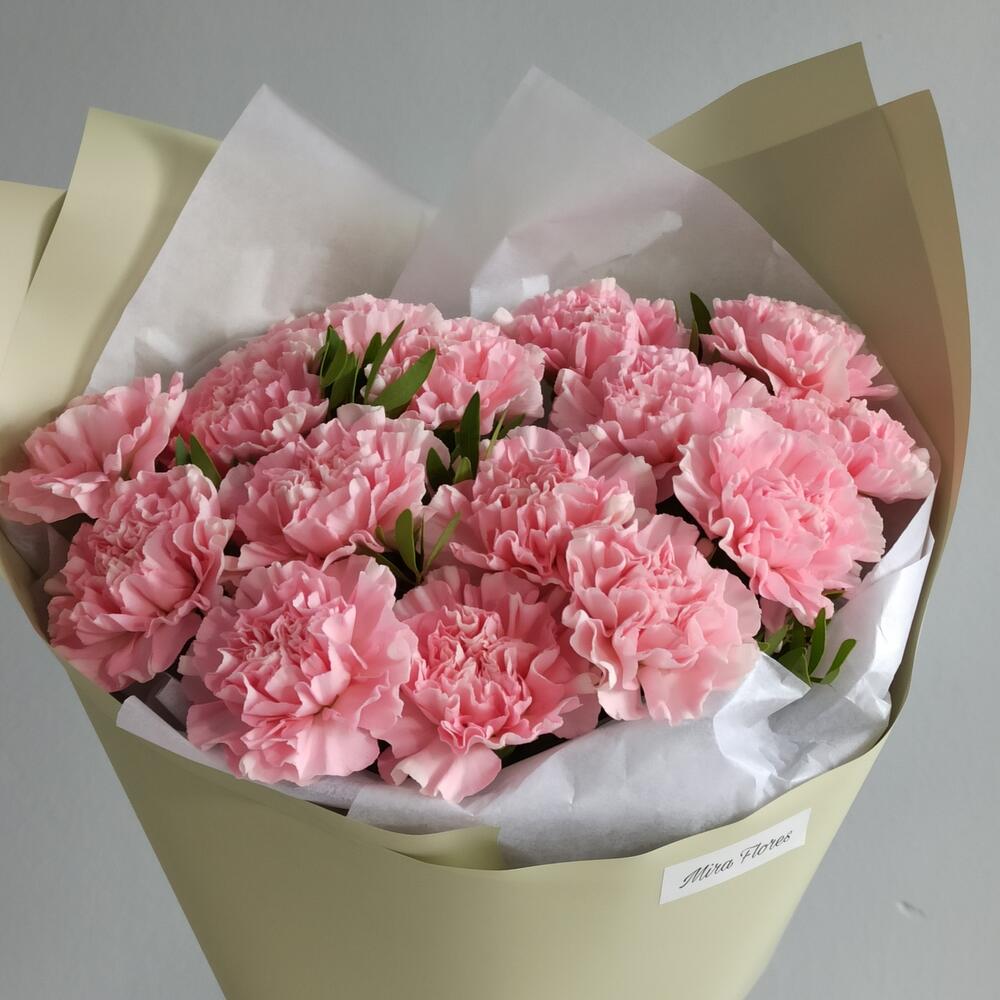 Гвоздика – 15 шт.Лента атласная – 1 шт.Фисташка – 2 шт.Упаковка дизайнерская – 2 шт.Тишью белое – 1 шт.