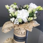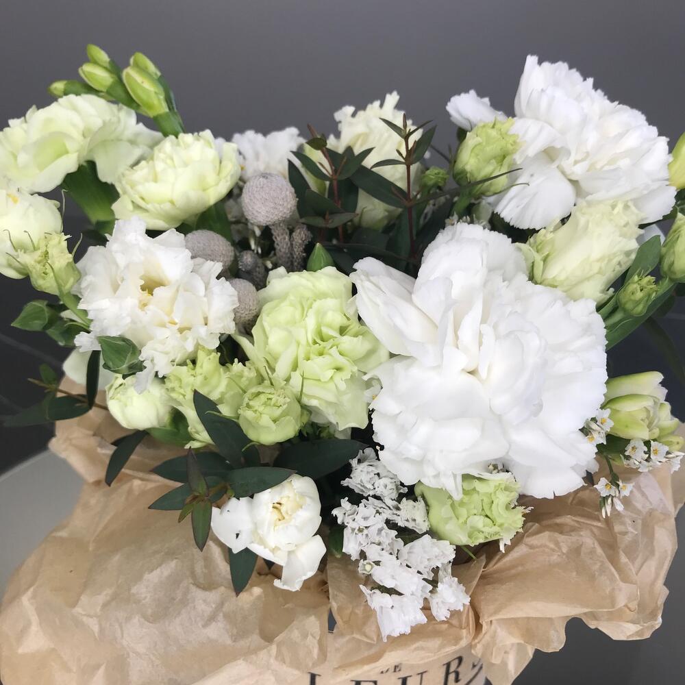 Цветочная композиция в корзине с белым лизиантусом "Нежная"