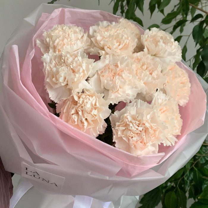 Гвоздика кремовая – 11 шт.Лента атласная – 1 шт.Упаковка дизайнерская – 2 шт.Кризал (подкормка) – 1 шт.Аквапак – 1 шт.инструкция по уходу за цветами – 1 шт.транспортировочная упаковка – 1 шт.