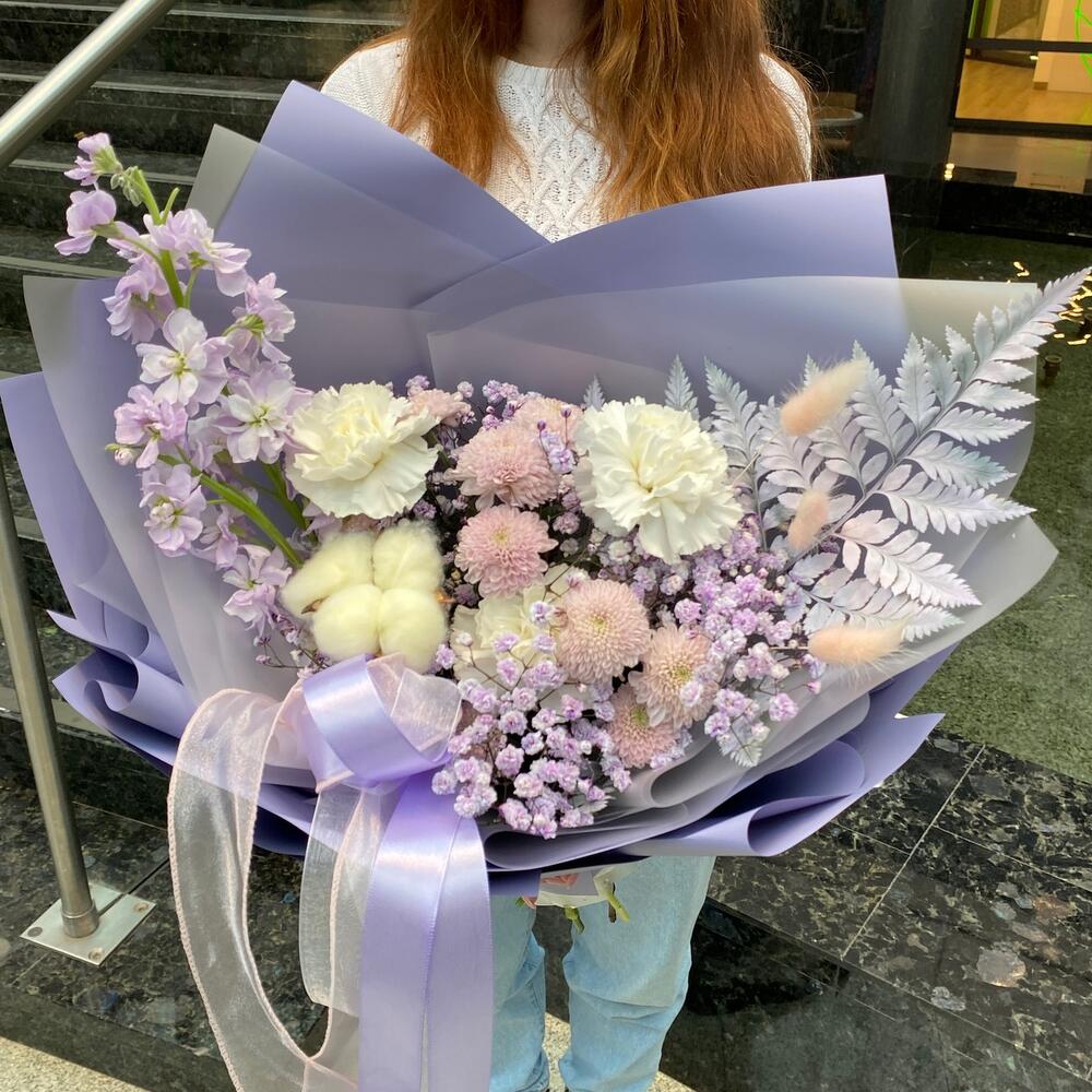 «Лавандовое созвездие» Букет из розы, гвоздики, статица и хлопка