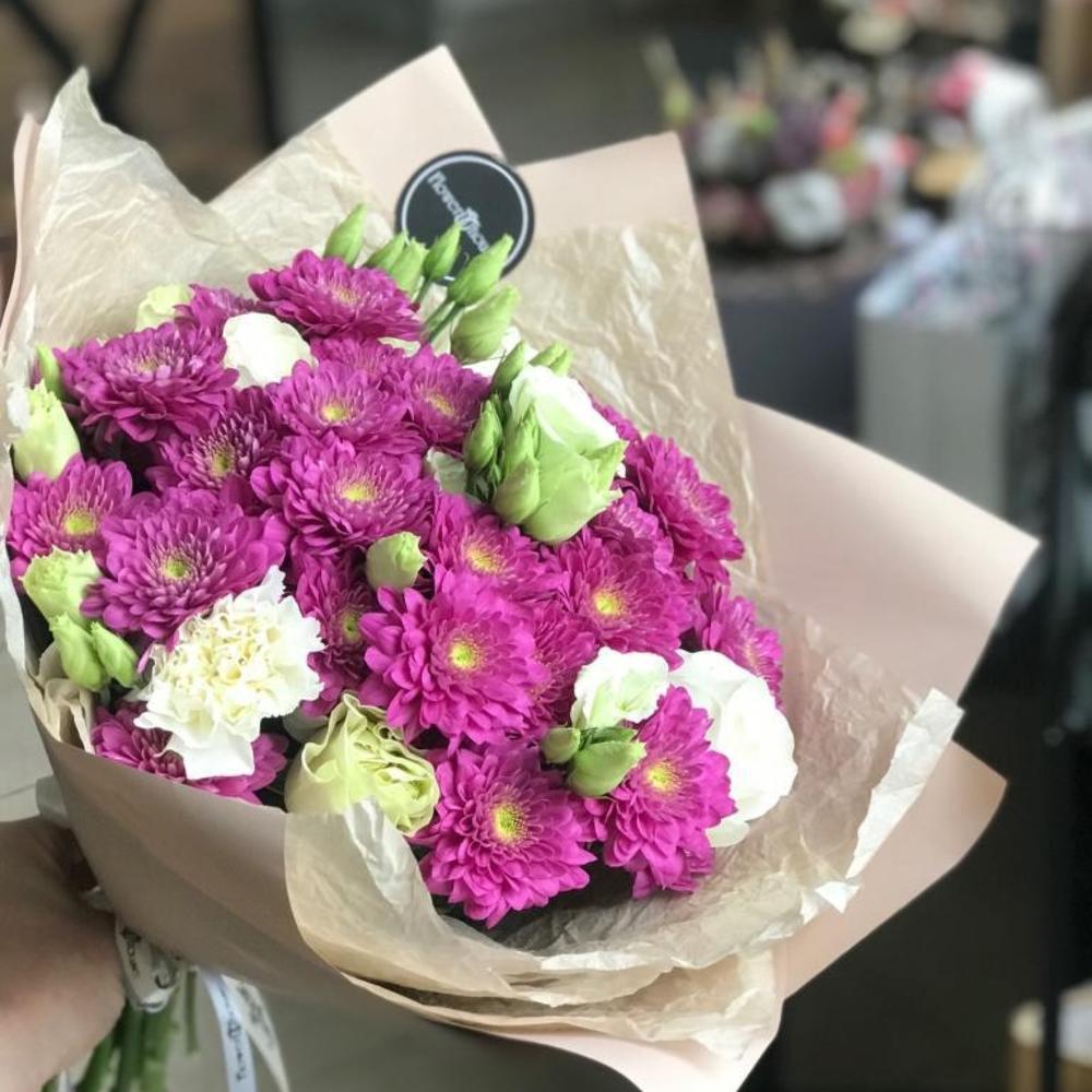 Хризантема кустовая – 5 шт.Гвоздика – 3 шт.Лента атласная – 2 шт.Тишью – 1 шт.эустома белая – 3 шт.Пленка дизайнерская – 3 шт.