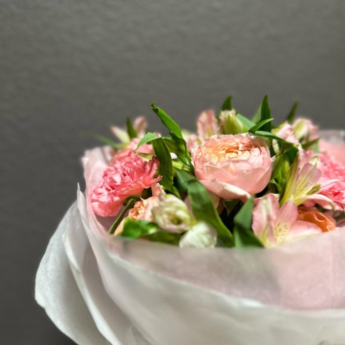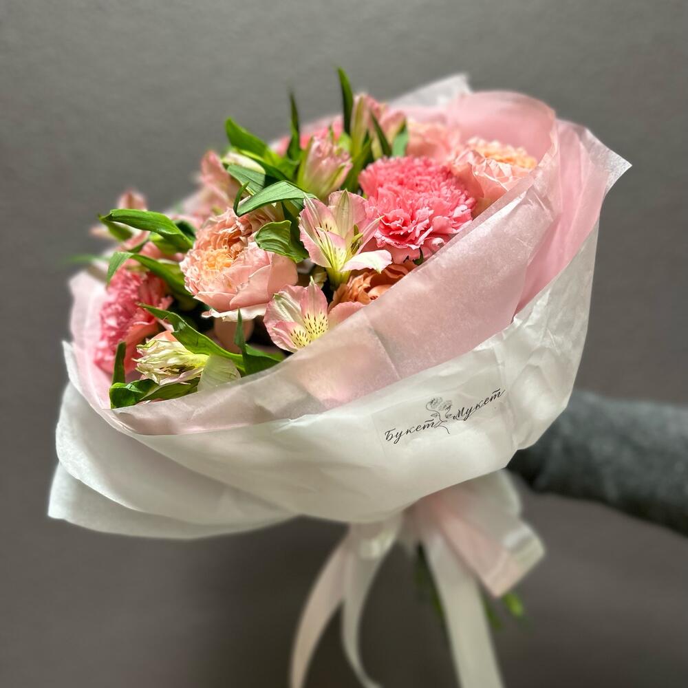 Альстромерия – 4 шт.Лента атласная – 2 шт.Тишью – 4 шт.Диантус – 3 шт.джульетта роза пионовидная – 2 шт.