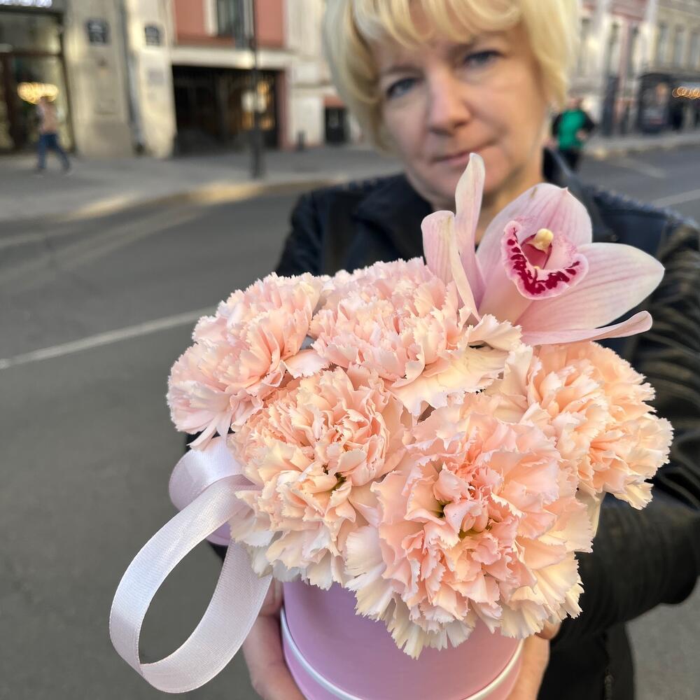 НЮ премиум мини-композиция из экзотической орхидеи и диантусов в шляпной коробке