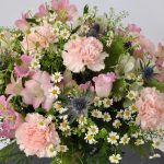 Альстромерия – 6 шт.Кампанула – 10 шт.Тласпи – 1 шт.Эрингиум – 4 шт.Гвоздика розовая – 9 шт.Ромашка кустовая – 15 шт.Фисташка – 8 шт.амбрелла – 3 шт.