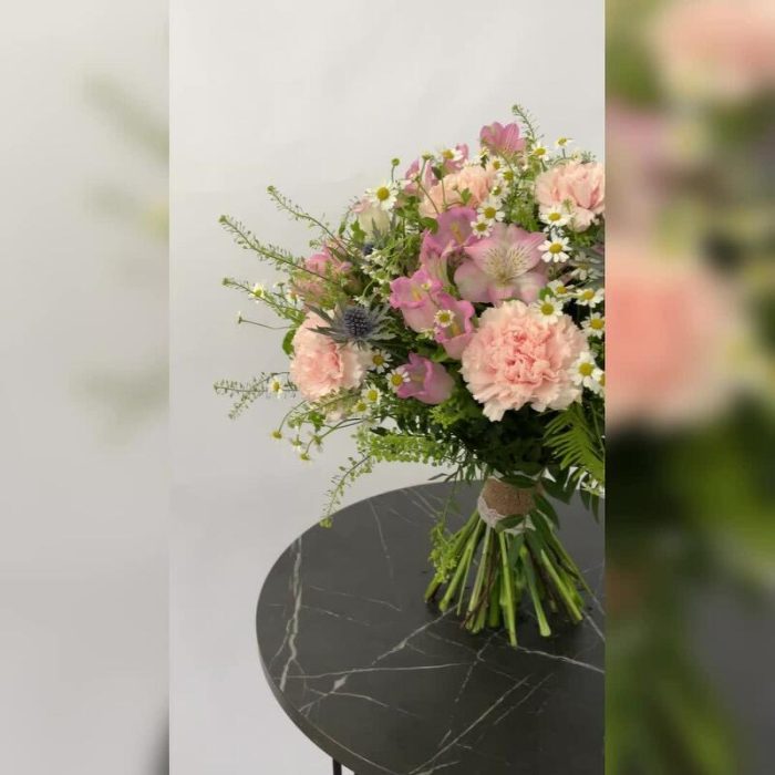 Ароматный букет с ромашками, колокольчиками и гвоздиками.Прелестные стойкие цветы слились в великолепном вальсе с голубыми колючками эрингиума, создавая непередаваемую атмосферу свободы, расслабления и счастья!Букет в европейском стиле, собран для вручения без упаковки!Будет красиво смотреться в вазе – круглый и нарядный со всех сторон!Истинная красота цветов для вашей ненаглядной.Доставим на воде и коробке, бережно и с заботой)