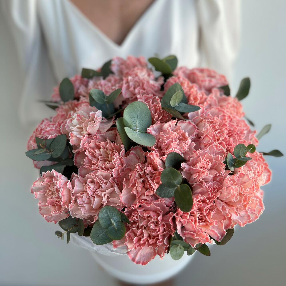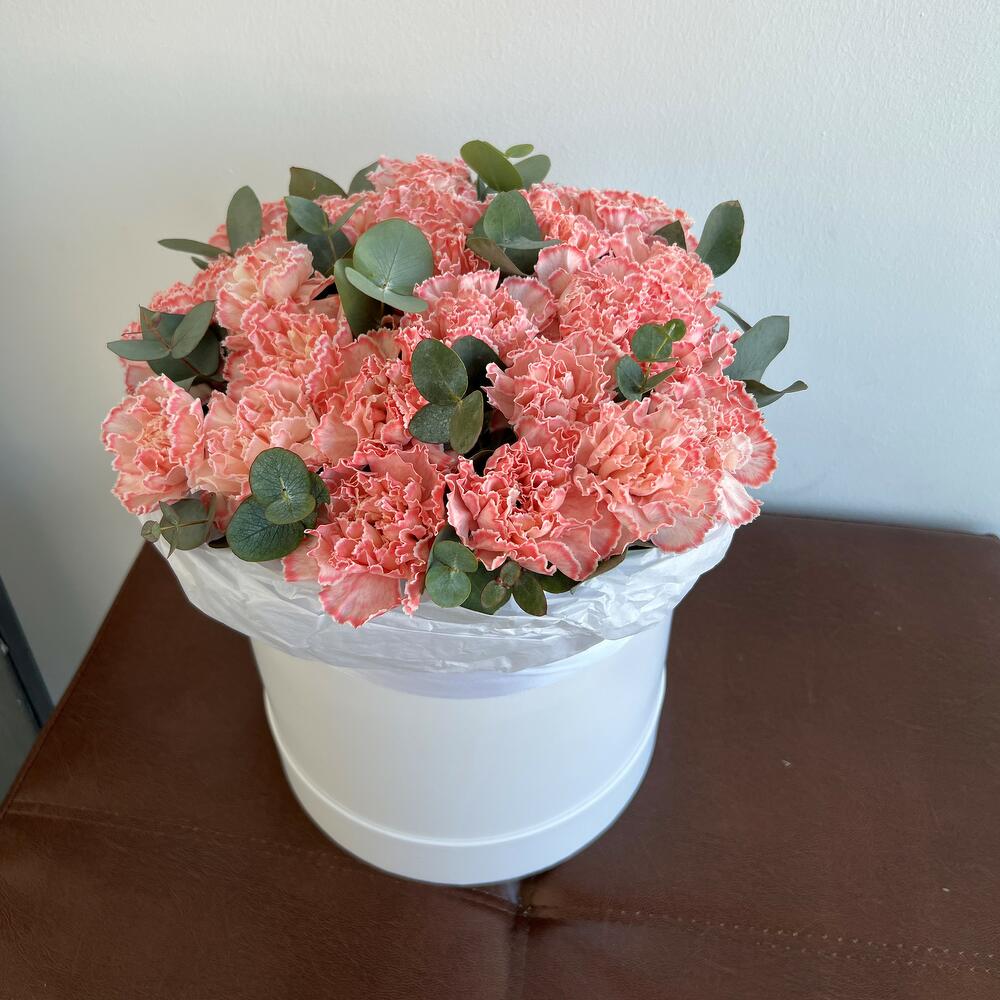 Шляпная коробка с розовой гвоздикой и эвкалиптом, 25 см в диаметре и 35 см высотой
