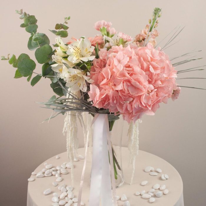 Ваза – 1 шт. Амарант – 1 шт. Альстромерия – 2 шт. Гвоздика одноголовая – 2 шт. Гербера – 1 шт. циперус папирус – 2 шт. Гортензия – 1 шт. Маттиола – 1 шт.