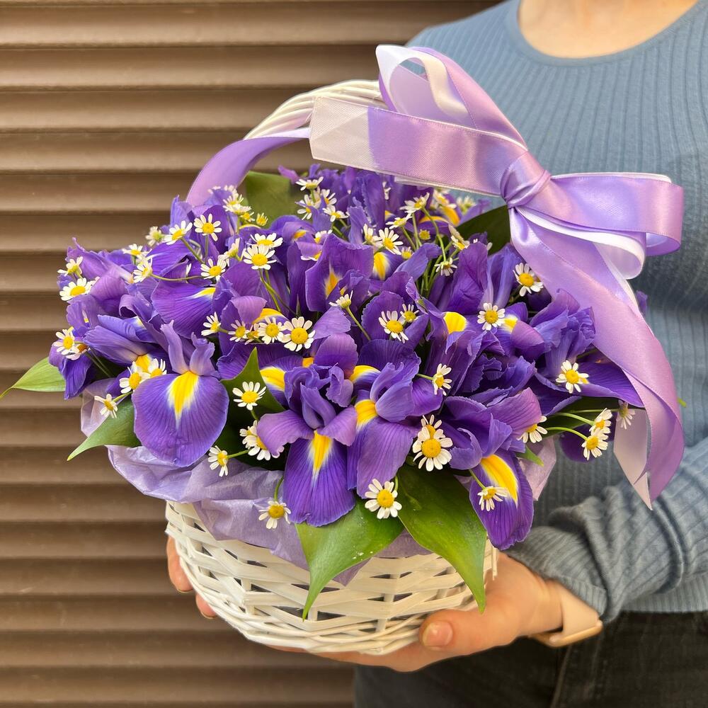 Корзина с ирисами и ромашками