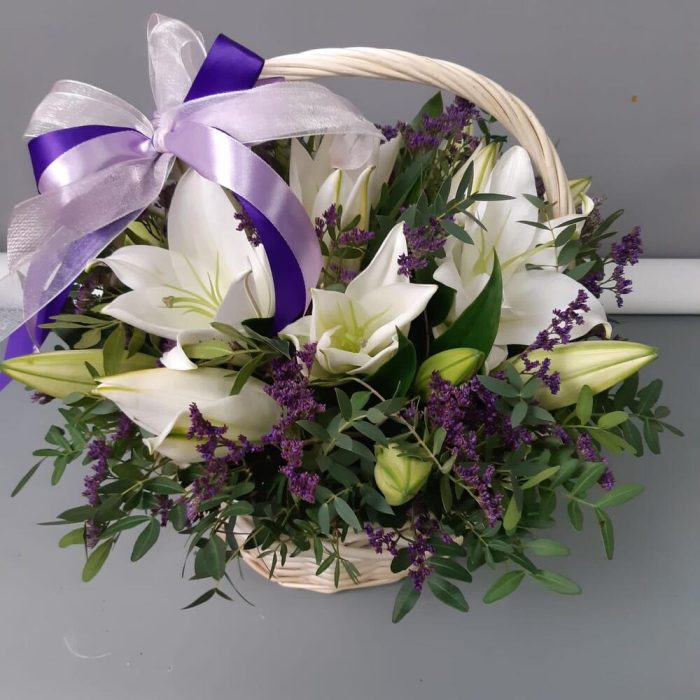 Корзина с лилиями и зеленью
