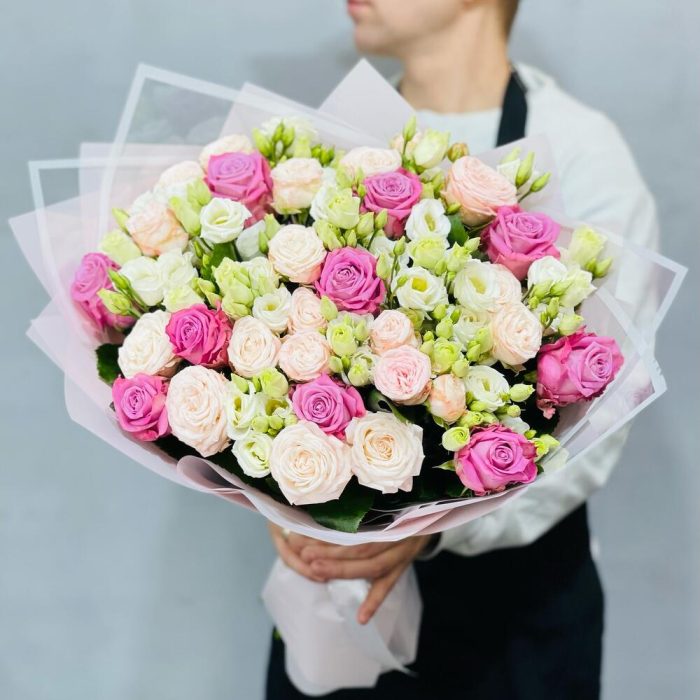Букет в таком сочетании нежности и легкости подарит только самые искренние и положительные эмоции. А стильная упаковка отлично дополняет его.Уход :1. После доставки букета обязательно подрежьте стебли на 1-2 см под косым углом.2. Налейте воду в вазу минимум 2/3 от высоты букета . 3. Меняйте воду , мойте вазу и подрезайте стебли каждый день. 4. Храните Цветы подальше от солнечных лучей, тепло-обогревателей, фруктов и сквозняков. 5. Если букет был доставлен в минусовую температуру, дайте цветам полежать 15-20 минут для того , чтобы они могли принять комнатную температуру. Затем подрежьте стебли и поставьте в вазу.