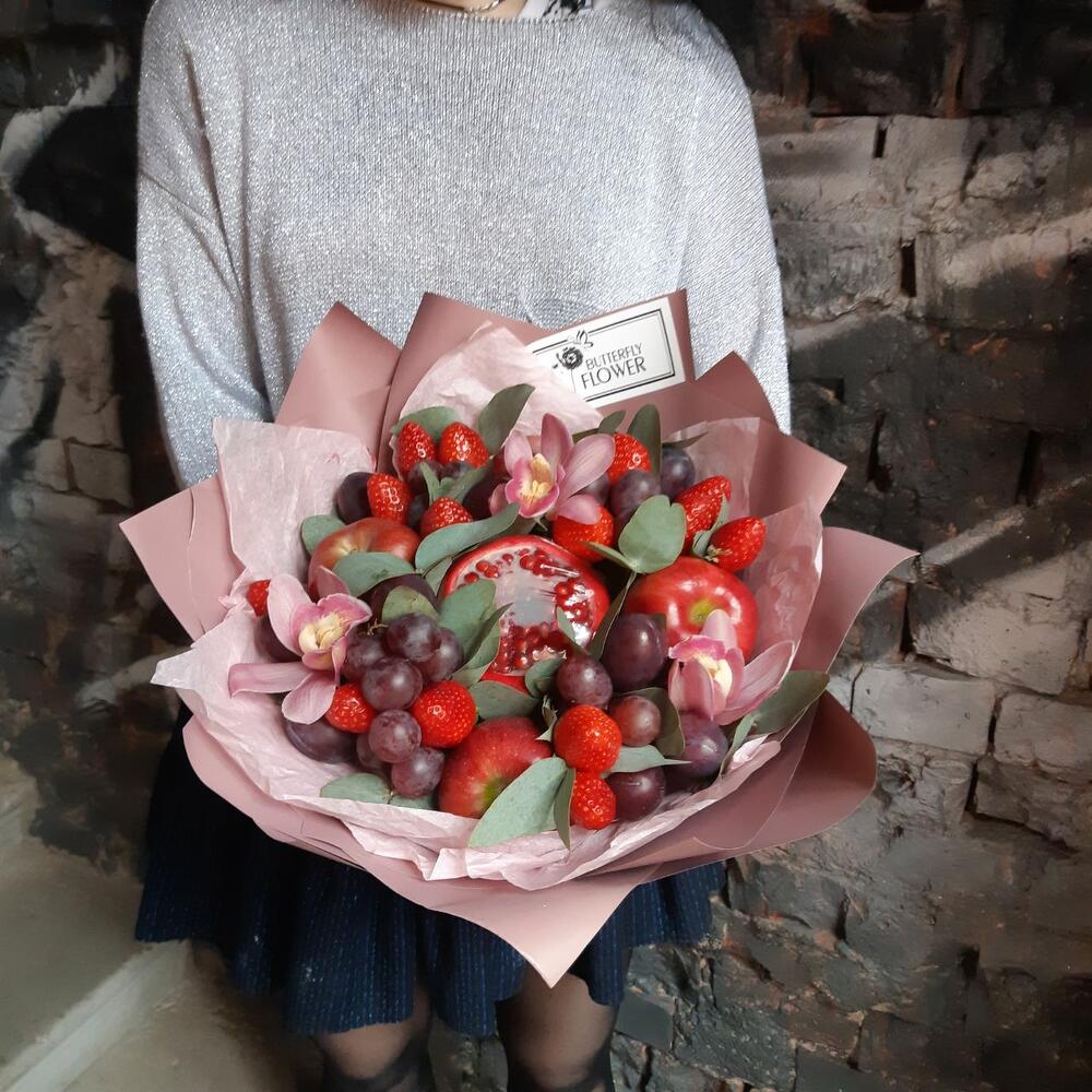 Клубника – 125 гр.Орхидея Цимбидиум – 3 шт.Эвкалипт – 1 шт.Гранат – 1 шт.Яблоко – 4 шт.Крафт – 2 шт.Слива – 8 шт.Виноград гроздь – 1 шт.