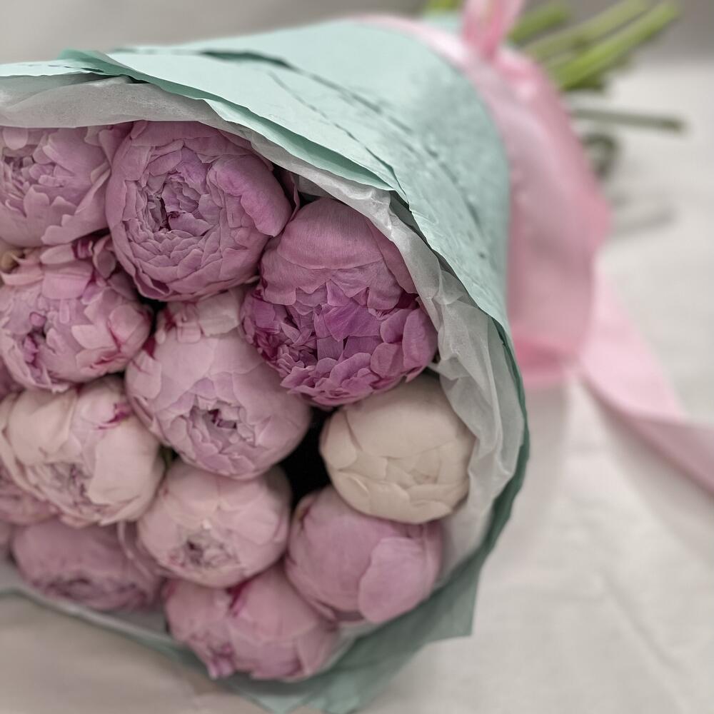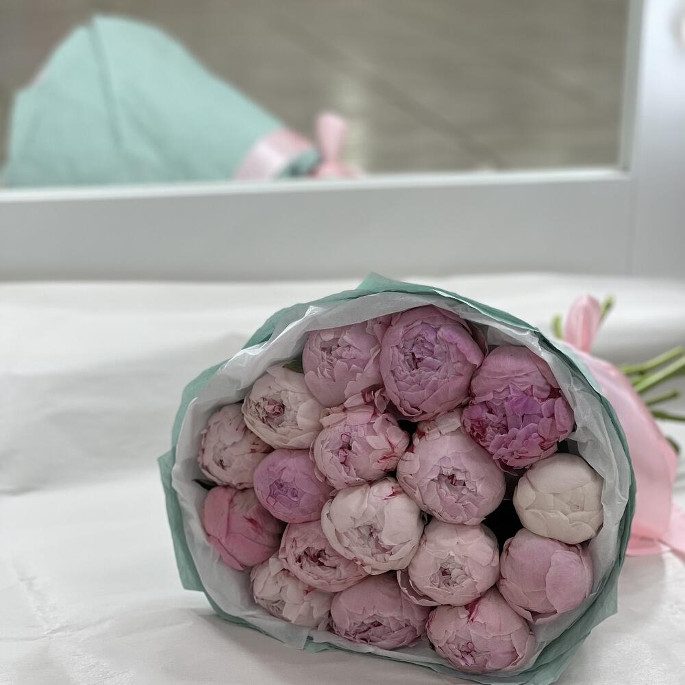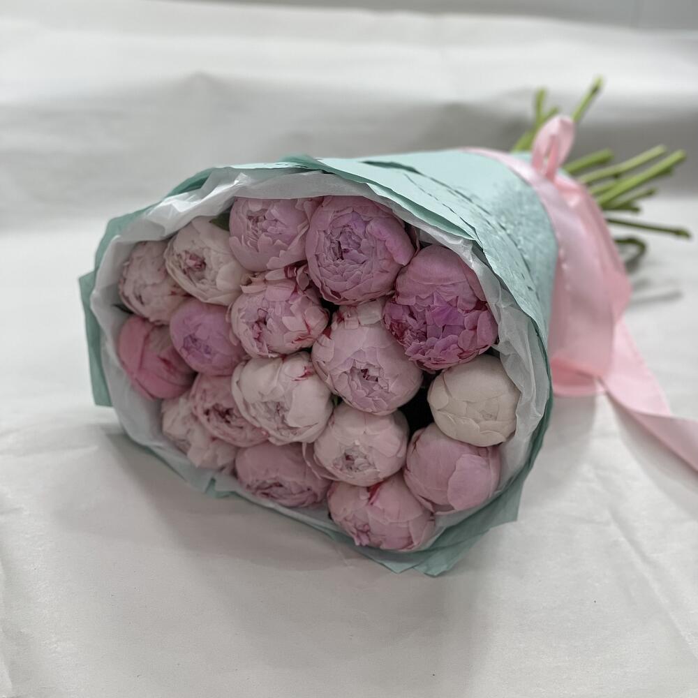 Атласная лента – 1 шт.Пион Сара Бернар – 17 шт.Дизайнерская упаковка – 1 шт.открыточка – 1 шт.