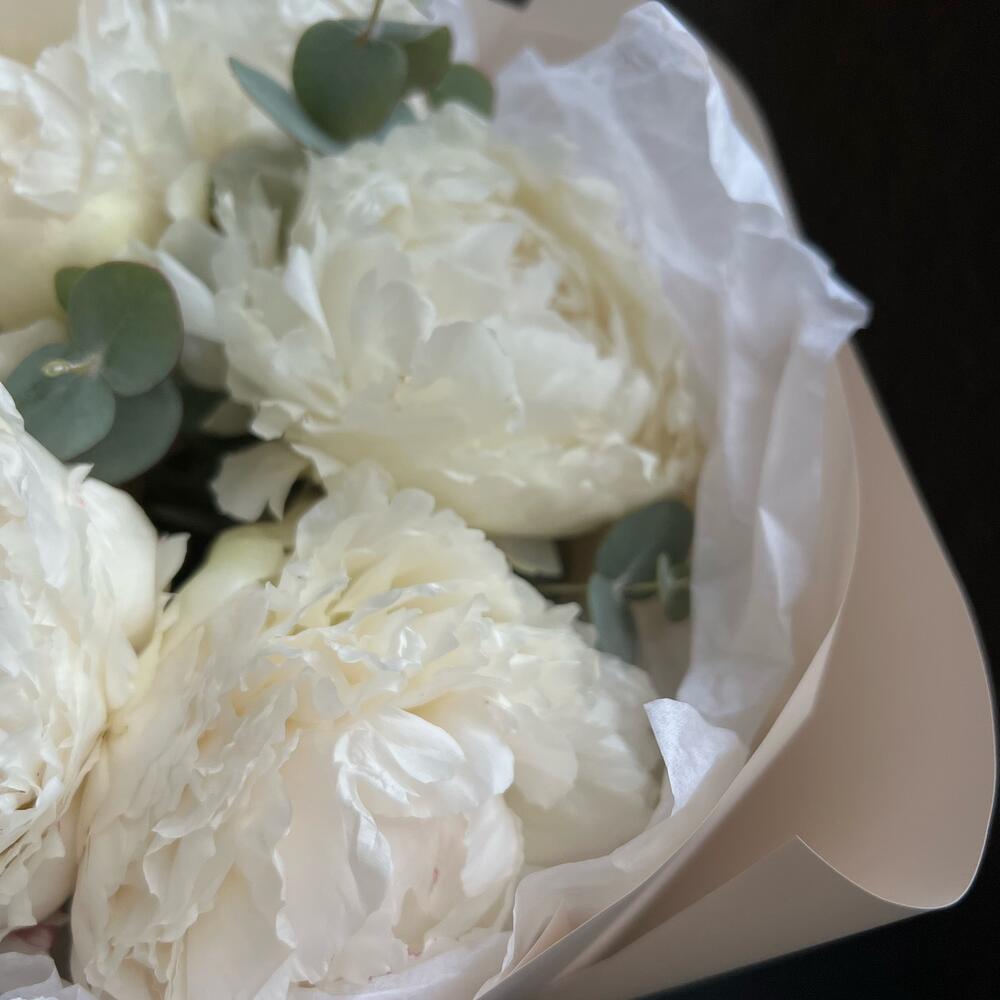 Эвкалипт – 5 шт.Атласная лента – 1 шт.декоративная упаковка – 1 шт.пионы – 5 шт.