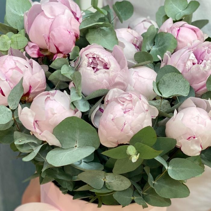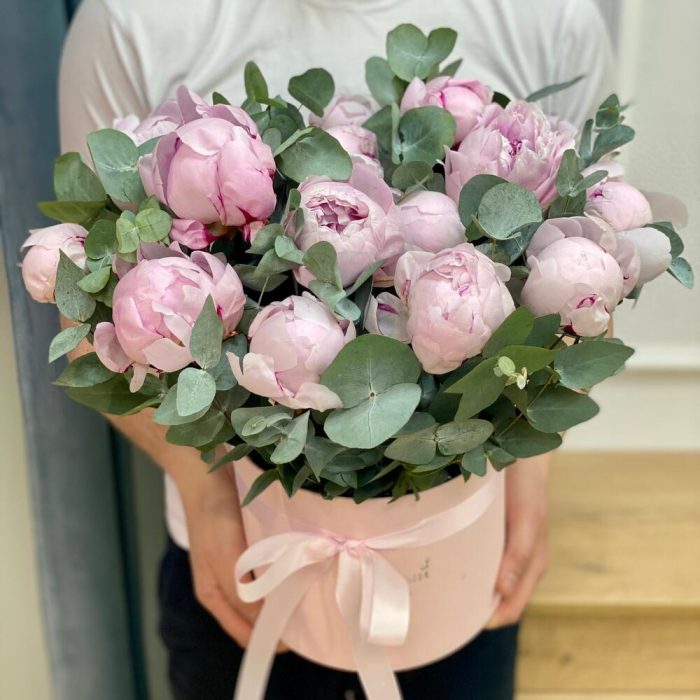 Авторская композиция из гортензий, роз и ранункулюсов в шляпной коробке