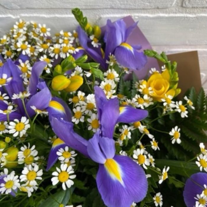 Ирисы фиолетовые – 9 шт.Фрезия желтая – 7 шт.Матрикария (Ромашка Камила) – 7 шт.
