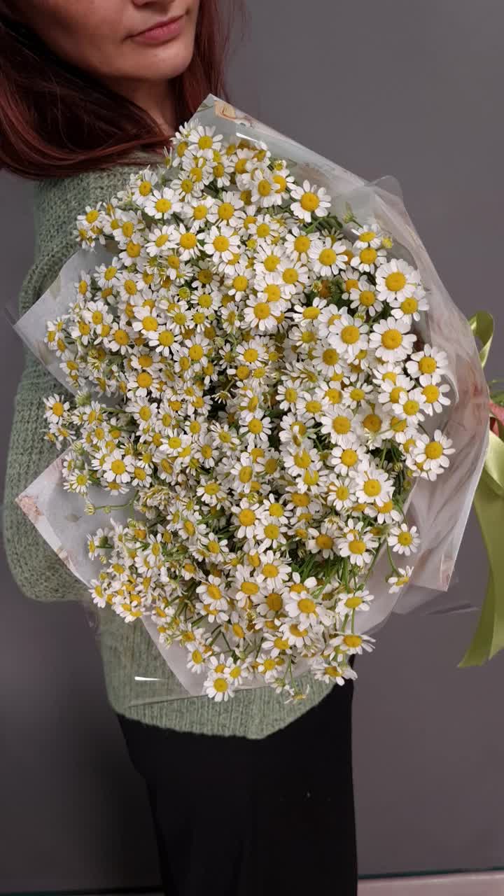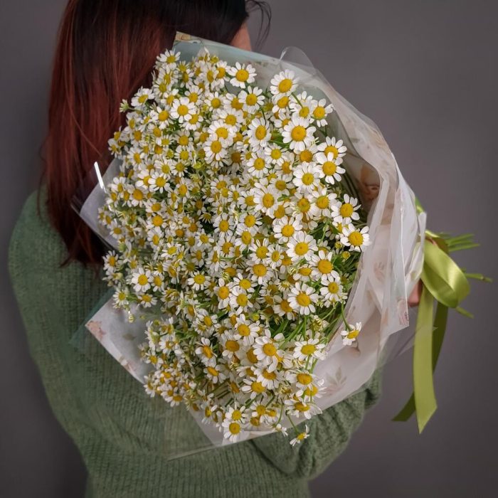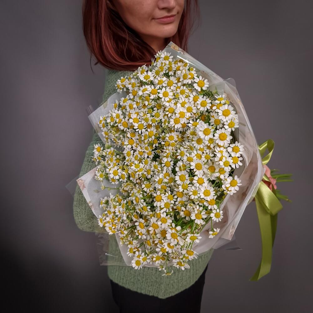 Ромашка кустовая – 21 шт.Упаковка дизайнерская – 1 шт.Аквапак – 1 шт.Средство для продления жизни цветов – 2 шт.