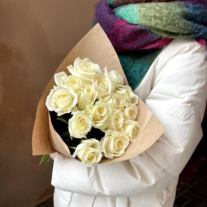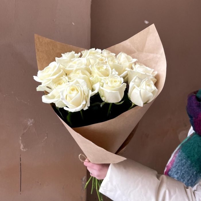 Крафтовая упаковка – 1 шт.Роза россия белая – 15 шт.