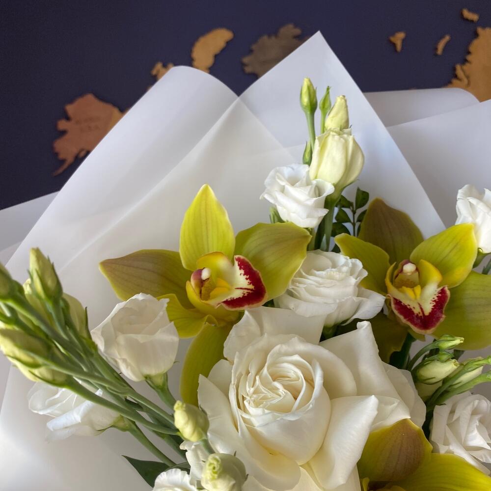 Орхидея Цимбидиум – 3 шт.Роза французская – 1 шт.Зелень – 1 шт.Лизиантус – 5 шт.Матовая пленка – 4 шт.Лента атласная – 1 шт.