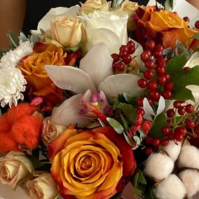 Роза Эквадор – 6 шт.Кустовая роза – 3 шт.Орхидея Цимбидиум – 1 шт.Калла – 1 шт.Хлопок – 2 шт.Сухоцветы – 3 шт.Фисташка – 3 шт.Салал – 3 шт.Пленка матовая – 6 шт.бант атласный – 2 шт.