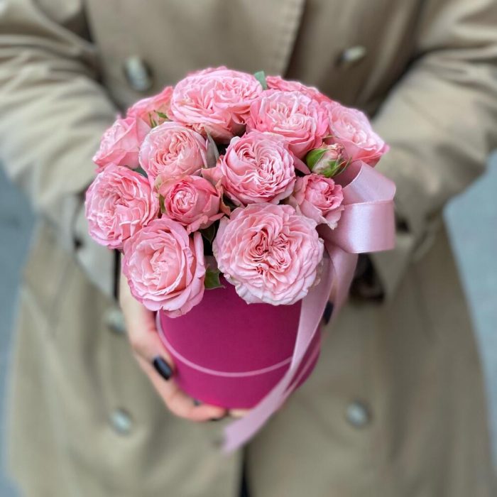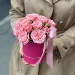 Роза кустовая Бомбастик – 3 шт.Эвкалипт – 2 шт.Шляпная коробка с лентами – 1 шт.