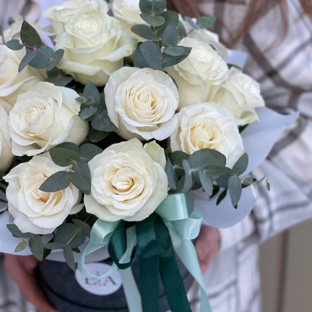 Белые кустовые розочки с эвкалиптом в коробке XS