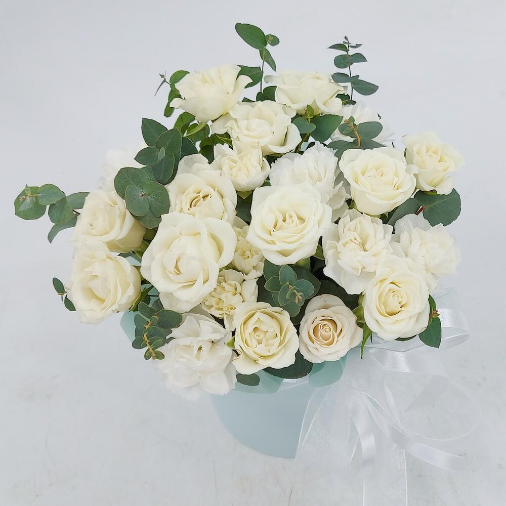 Белые кустовые розочки с эвкалиптом в коробке XS