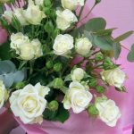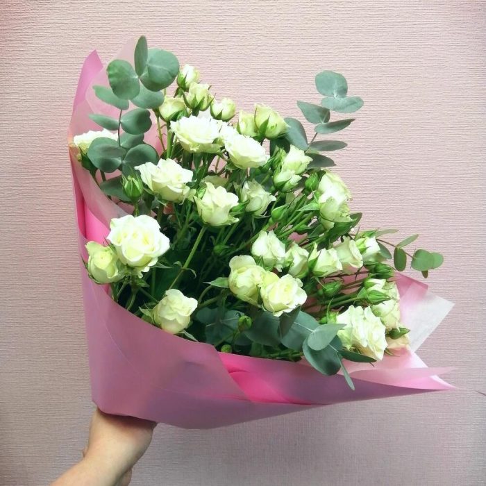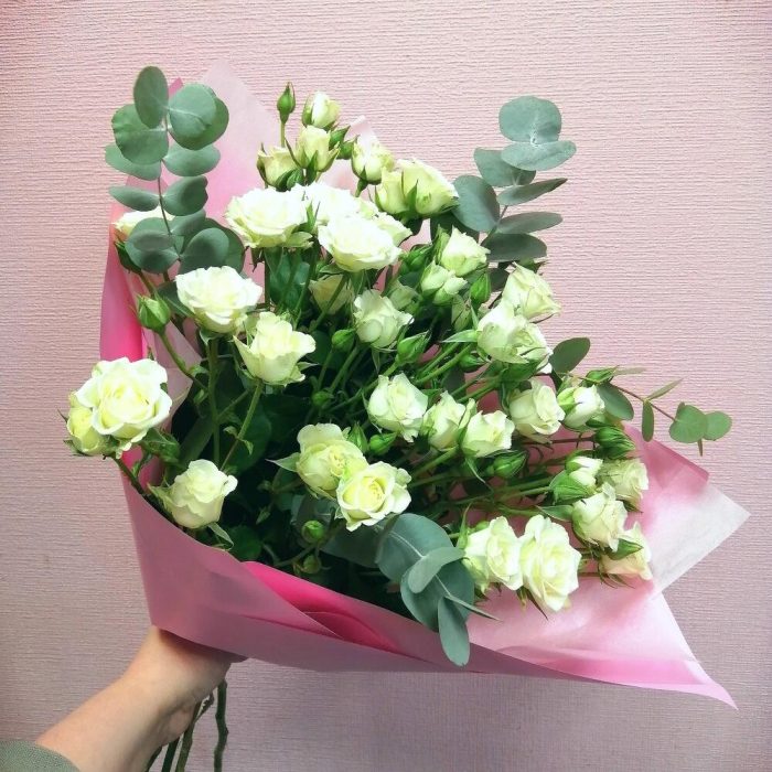 Букет белых кустовых роз с эвкалиптом