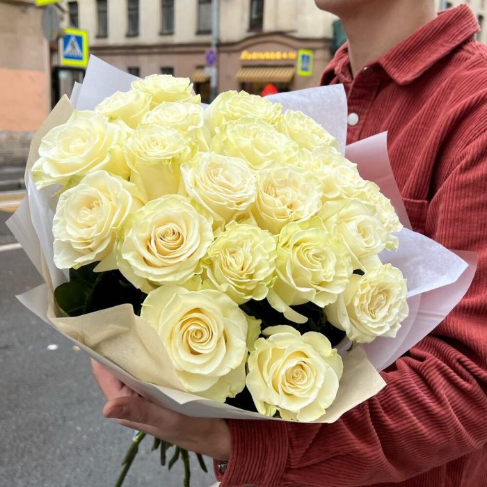 белая роза мондиаль – 19 шт.Упаковка дизайнерская – 3 шт.Лента атласная белая – 1 шт.