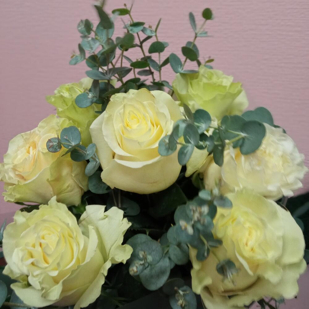 Лента – 1 шт.Эвкалипт – 5 шт.Роза Эквадор – 7 шт.Упаковка – 1 шт.