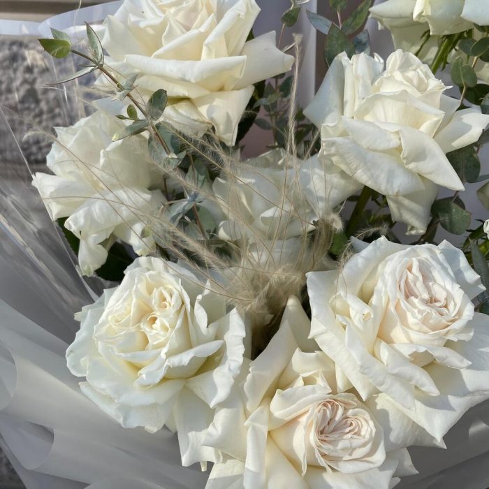 Эвкалипт – 4 шт.Роза – 9 шт.Лента атласная – 2 шт.Упаковка дизайнерская – 6 шт.Ковыль – 1 шт.