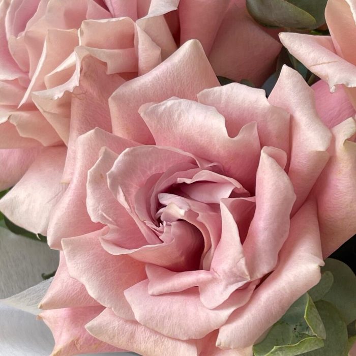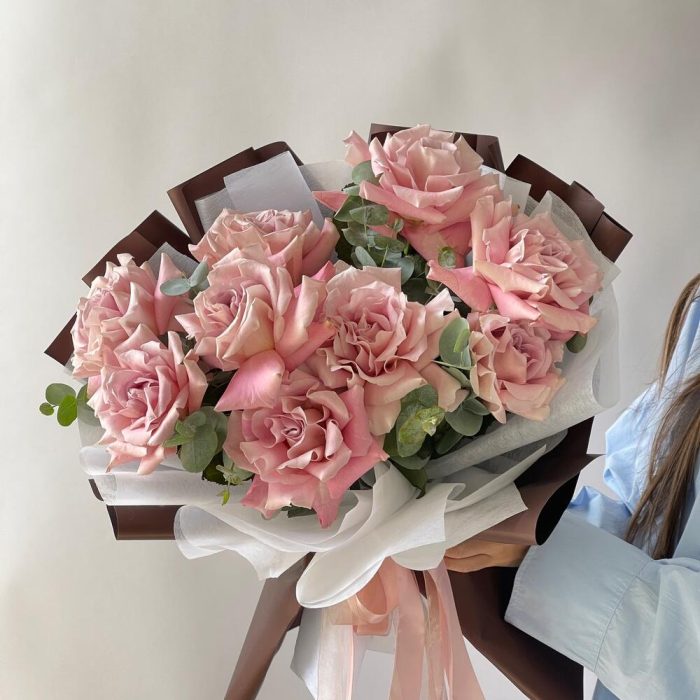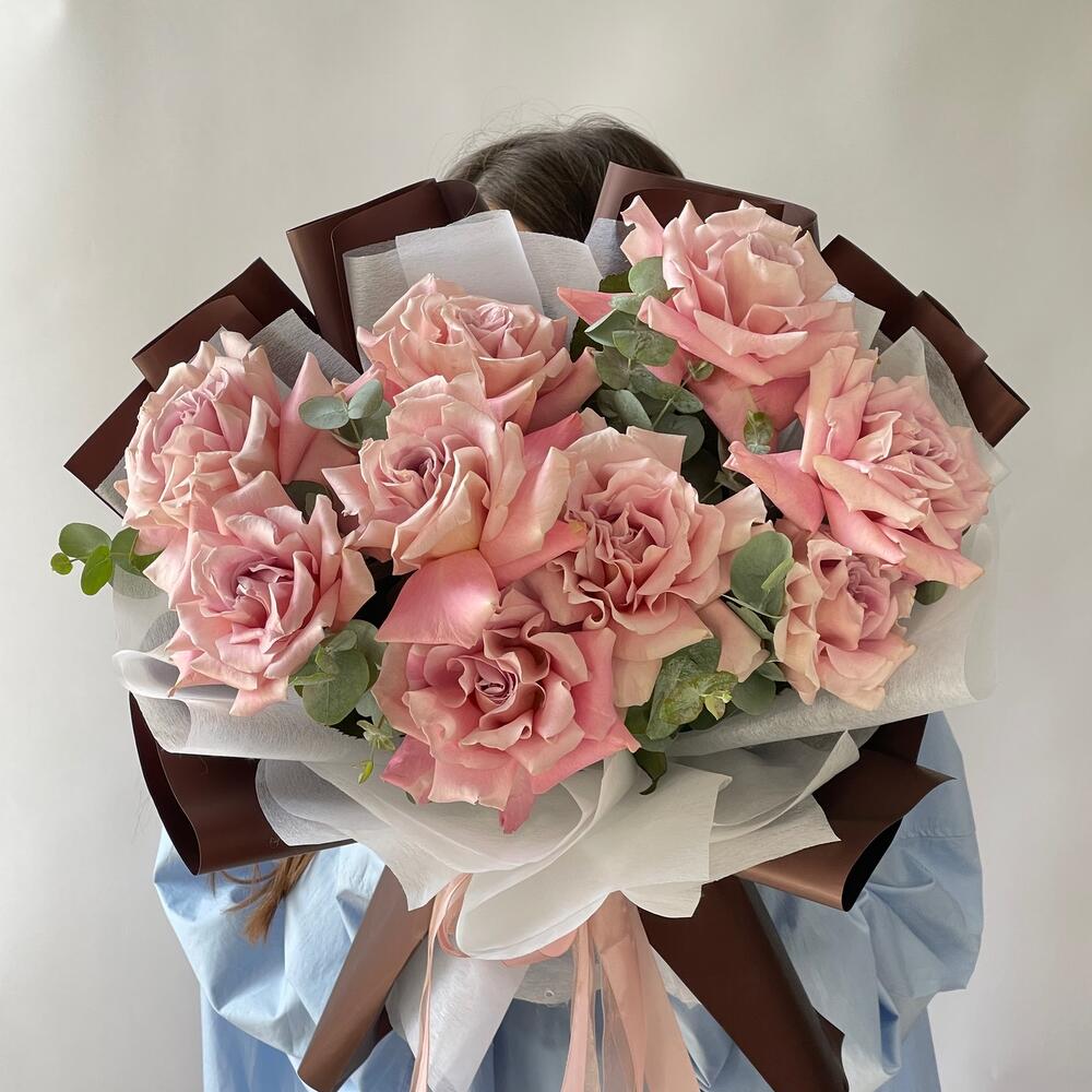 Лента – 2 шт.Эвкалипт – 2 шт.Упаковка дизайнерская – 3 шт.Роза французская – 9 шт.