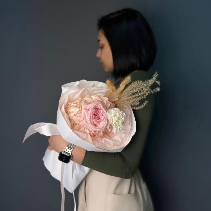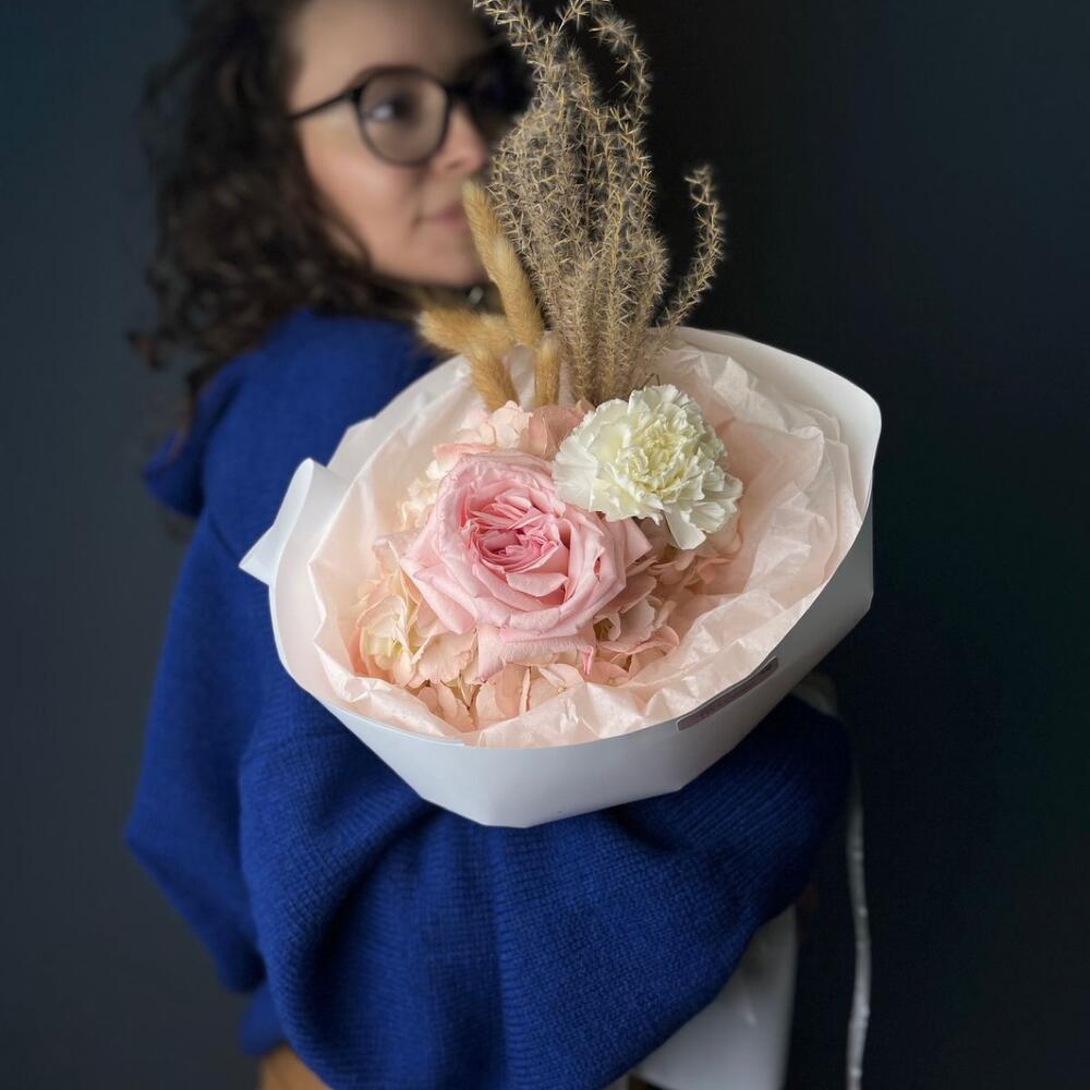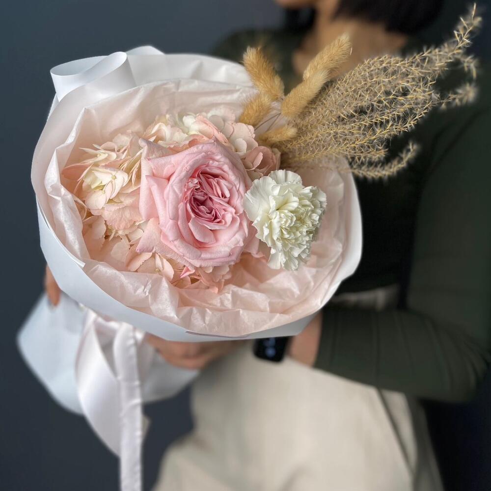 Гортензия – 1 шт.Гвоздика – 1 шт.Сухоцветы – 6 шт.Упаковка дизайнерская – 2 шт.роза кендилайт – 1 шт.