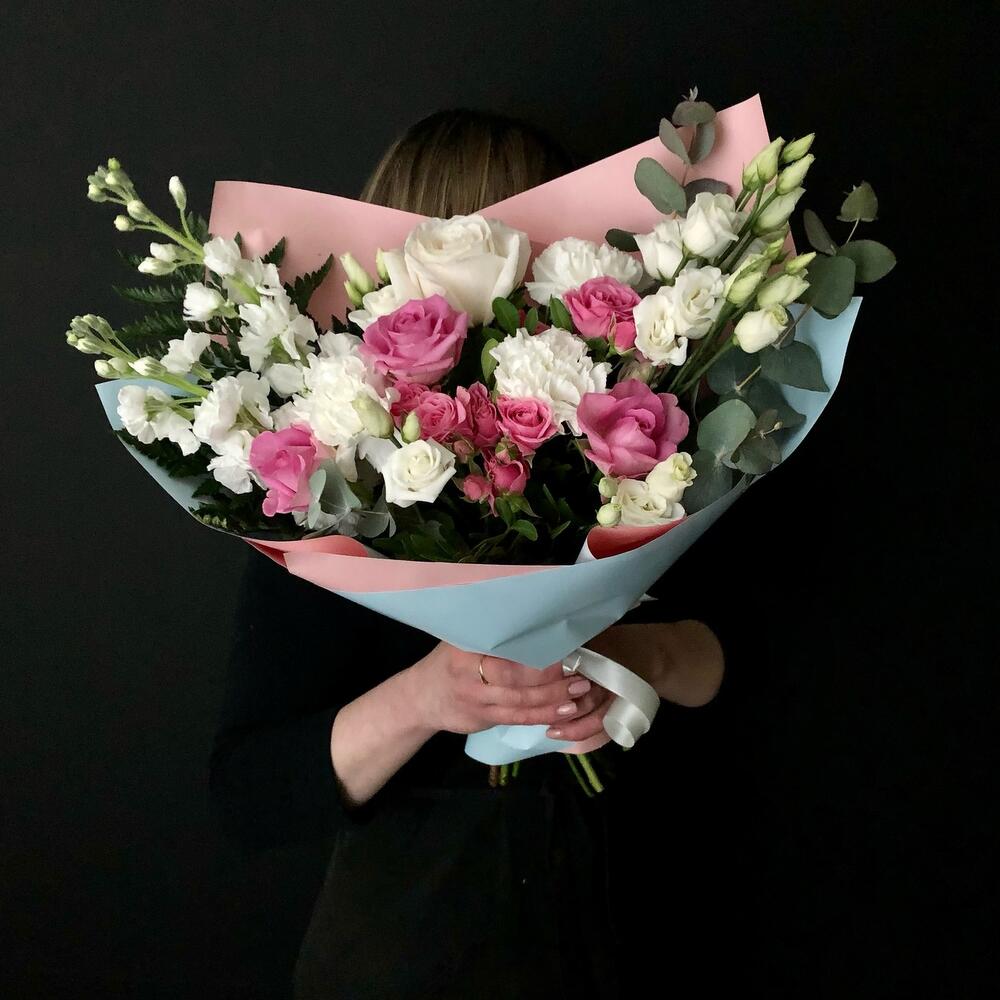 Маттиола – 2 шт.Роза кустовая – 2 шт.Эвкалипт – 2 шт.Роза – 3 шт.Диантус – 3 шт.Фисташка – 3 шт.эустома белая – 2 шт.Эквадор роза – 1 шт.Дизайнерская упаковка – 2 шт.