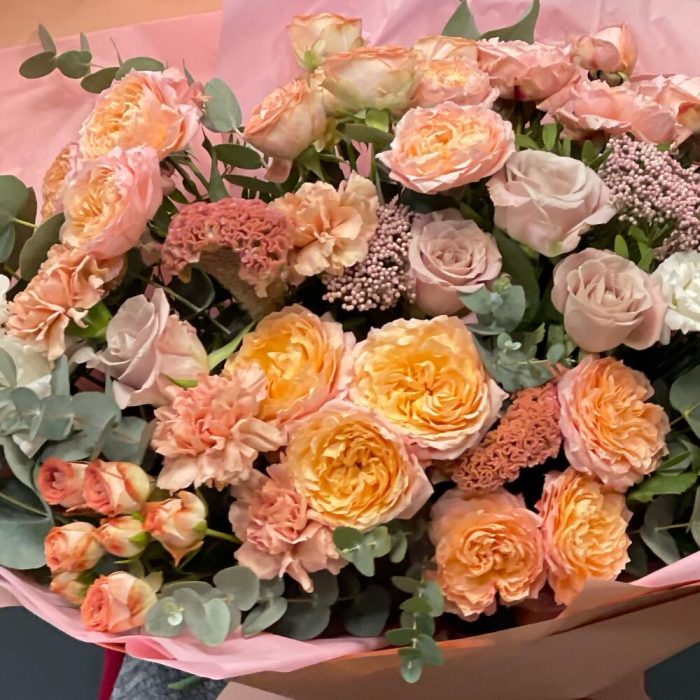Роза пионовидная кустовая – 4 шт.Роза одноголовая – 5 шт.Гвоздика сортовая – 7 шт.Лизиантус – 3 шт.Ваксфлауэр – 1 шт.Роза кустовая – 2 шт.Озотамнус – 2 шт.Эвкалипт – 3 шт.Фисташка – 5 шт.Упаковка – 3 шт.Лента атласная – 2 шт.