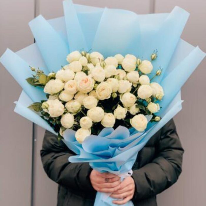 Пионовидная роза – 9 шт. Современная упаковка – 1 шт. Лента – 1 шт.
