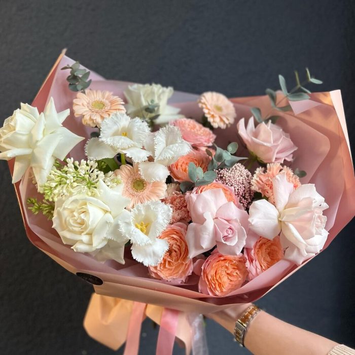 Кустовая пионовидная роза – 2 шт.Одноголовая роза – 6 шт.Гербера – 3 шт.Тюльпан – 3 шт.Озотамнус – 1 шт.Сирень – 1 шт.Эвкалипт – 3 шт.декоративная упаковка – 1 шт.Атласная лента – 1 шт.